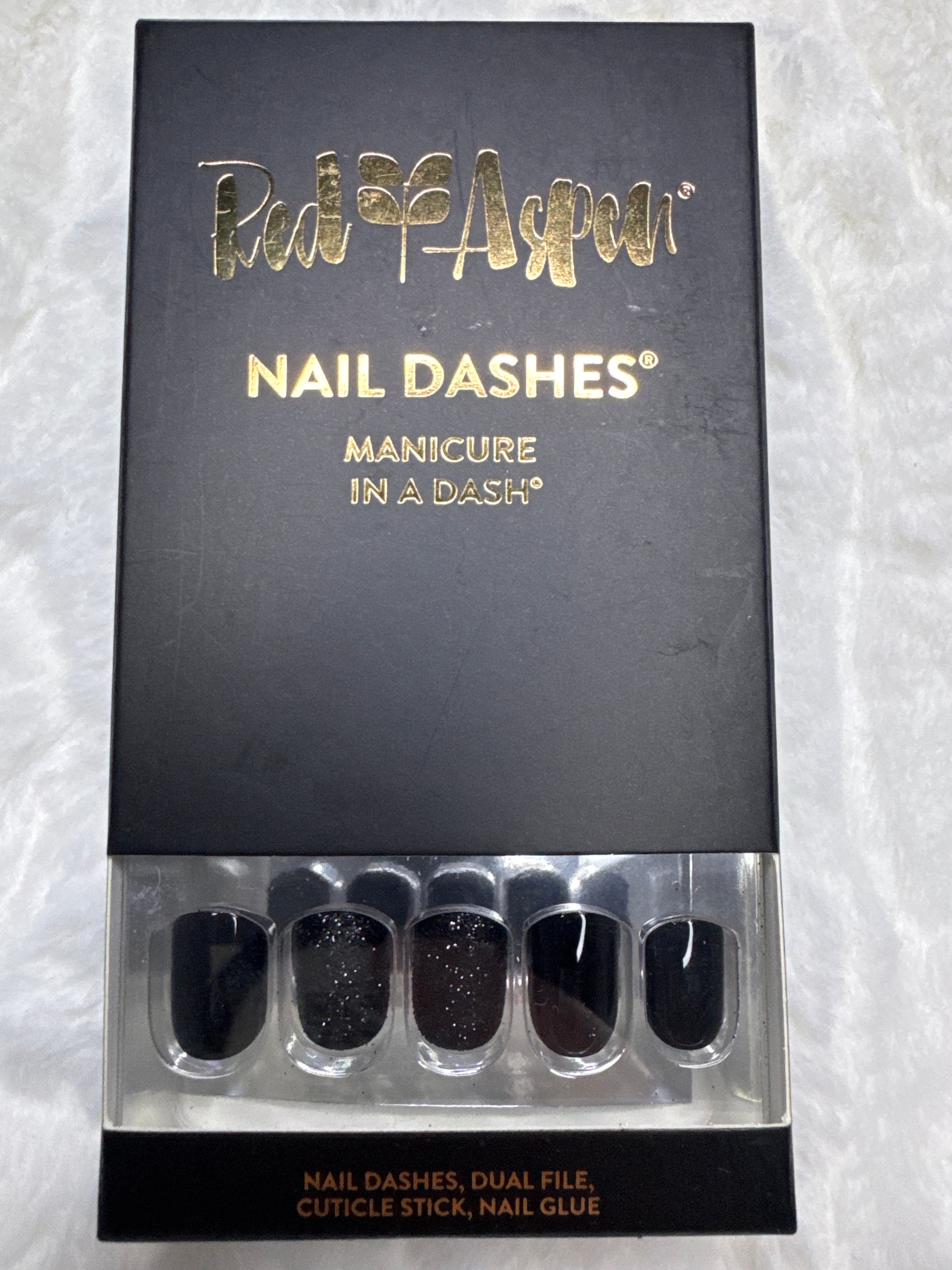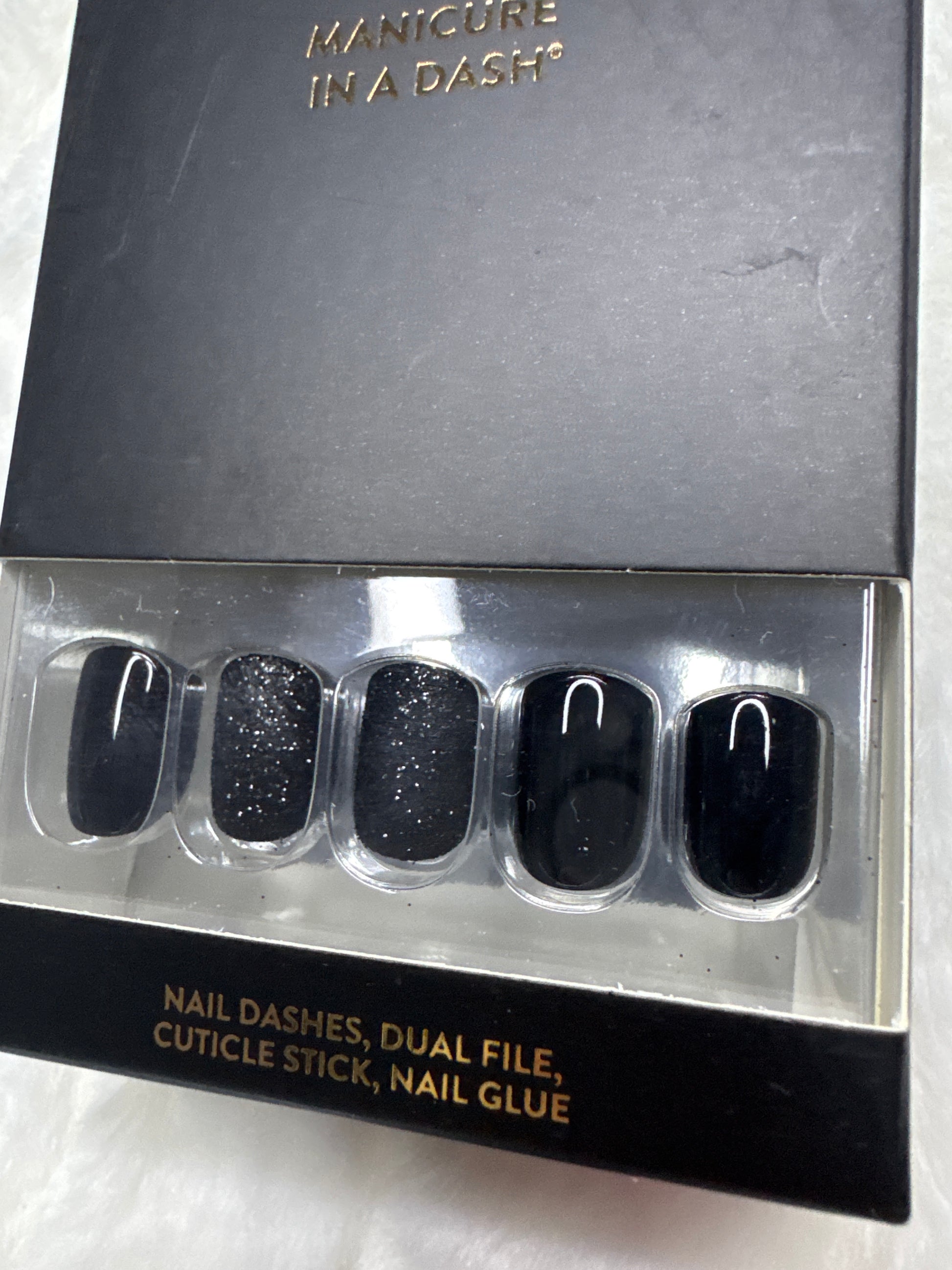 Short Square, shiny black and black glitter nails