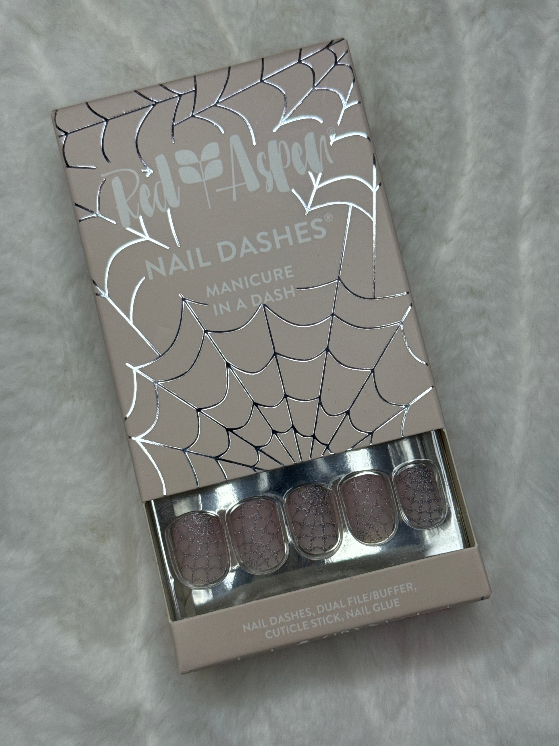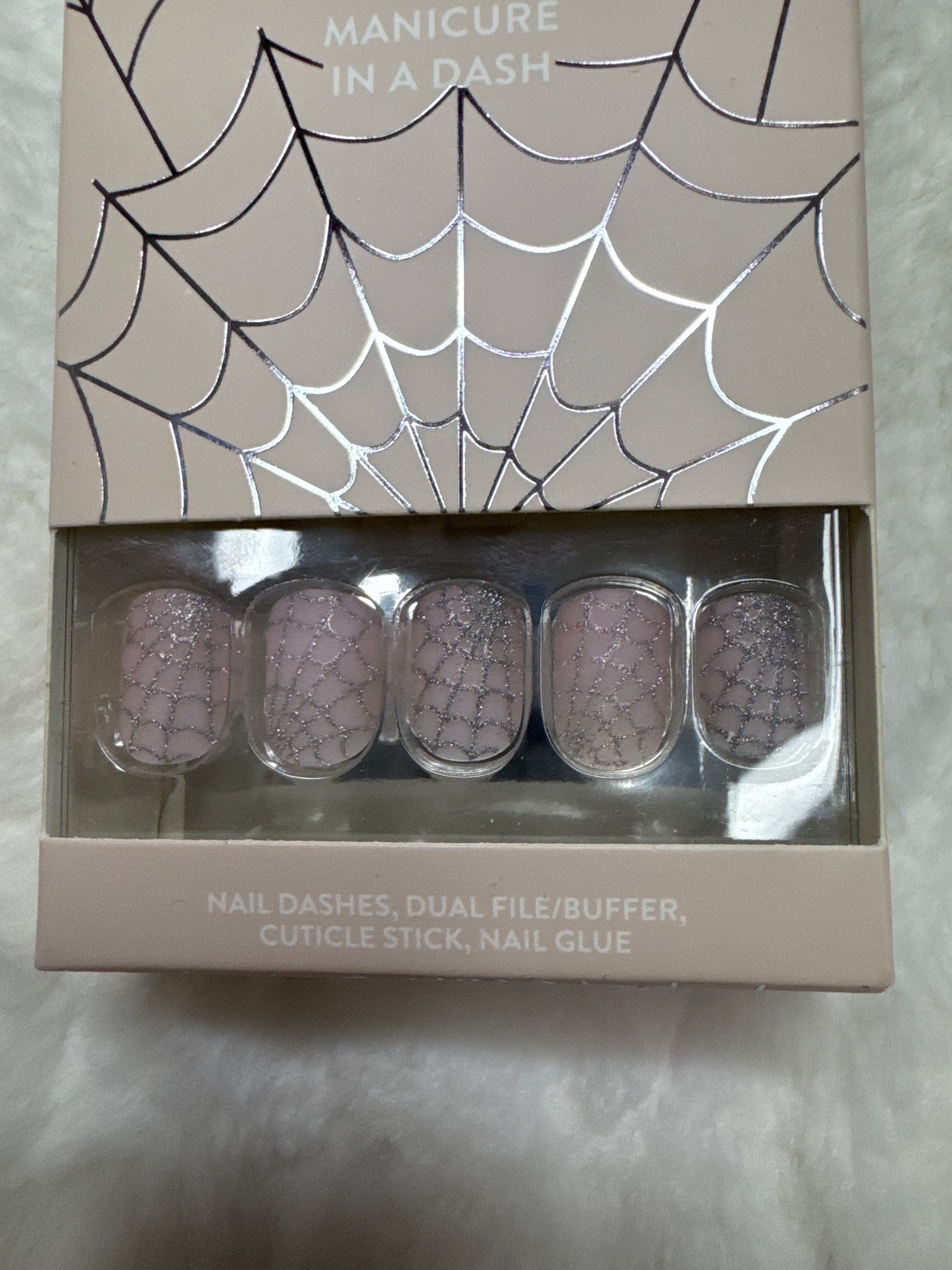 Short Square, Halloween Collection Nail Dash, light pink with silver glitter web design