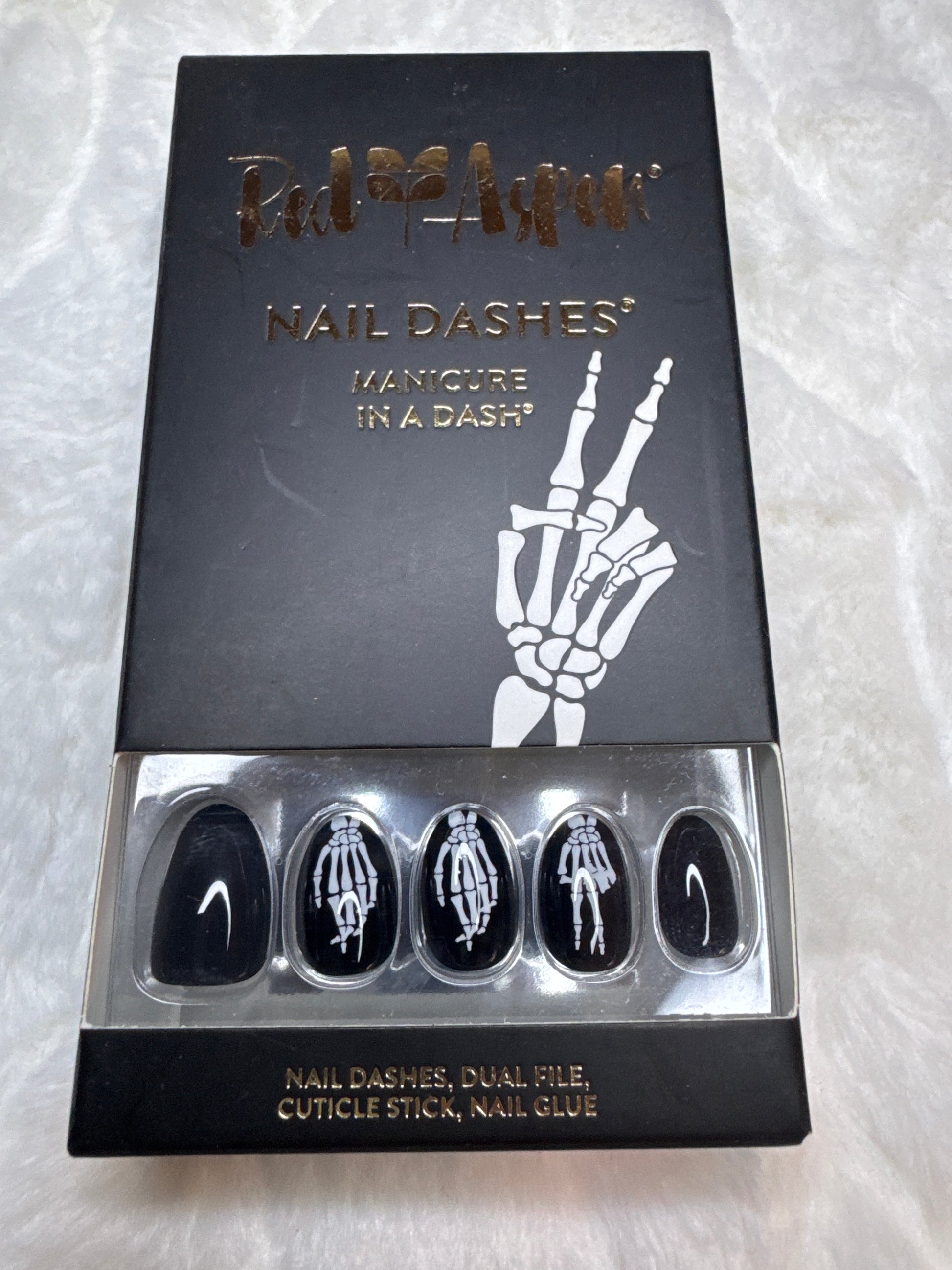 Short Almond, shiny black with skeleton hands